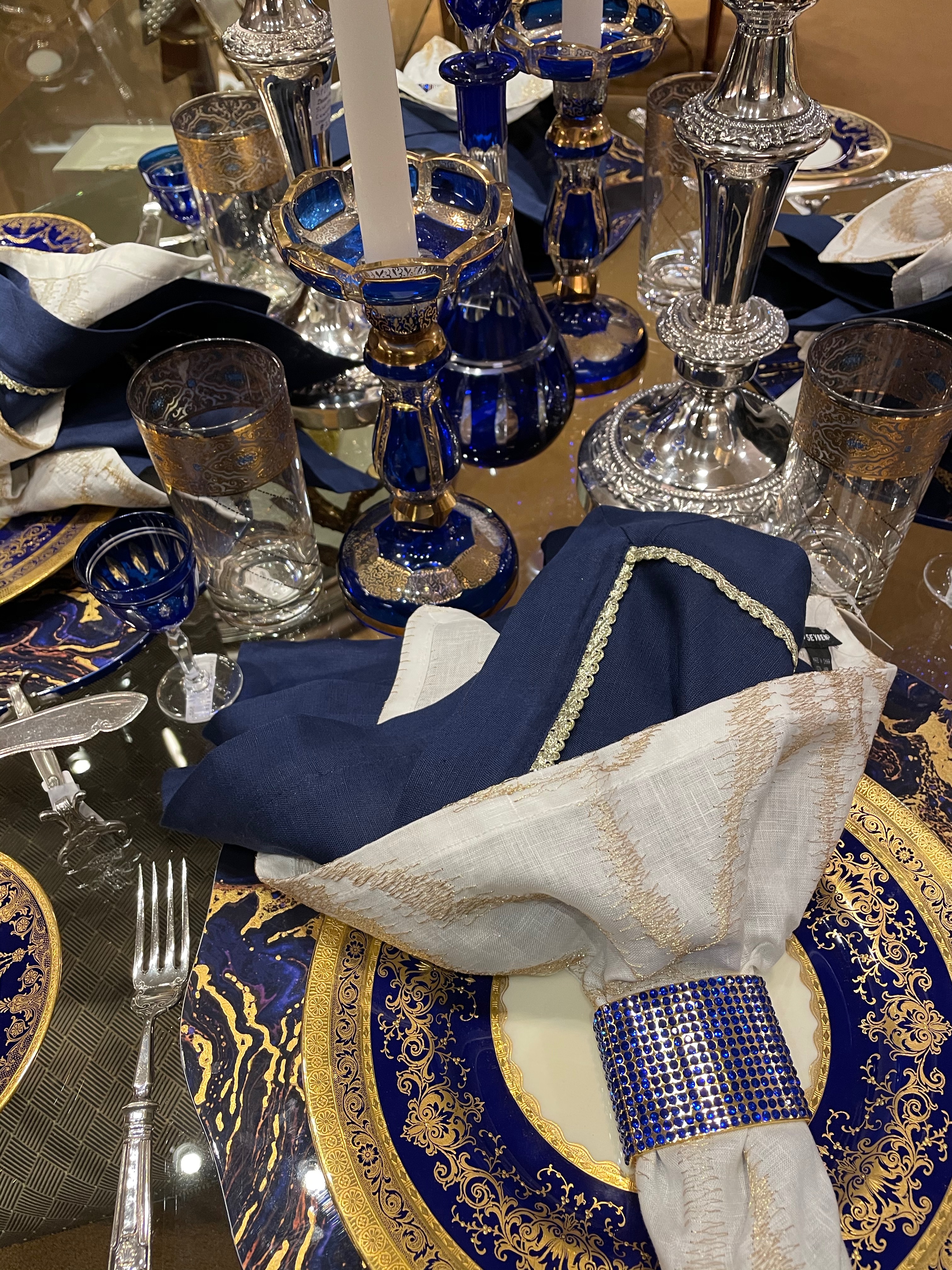 There is something so special about a sparkly holiday table. It just makes you feel festive. Strolling down Fifth Avenue today I decided to pop into Bergdorf Goodman and visit the holiday decor floor. Every year I like to buy one or two ornaments there to add to the tree. This year my friend Jen and I were taken aback by the beautiful glittering table settings they had on display. Imagine being invited to such a gorgeous dinner. I had to share pictures to start putting everyone in the holiday spirit. The trick to a great table is to have objects at different heights in the middle of the table. Decorative objects and candlelight work well. Pick a color scheme and then work within that. Use jewel tones around the holidays to represent the time of year. You do not have to spend a fortune to create a festive look. Try using a luxurious velvet tablecloth in green or blue like this one from Amazon ($18.39) as the base for your holiday decor. Then you can add a charger or beaded placemat and top your dinner plates with a napkin tucked into a napkin ring. A bowl full of ornaments surrounded by candles can work well as a centerpiece. Use my pictures for inspiration and let me know how your table decor turns out. Have fun with it.